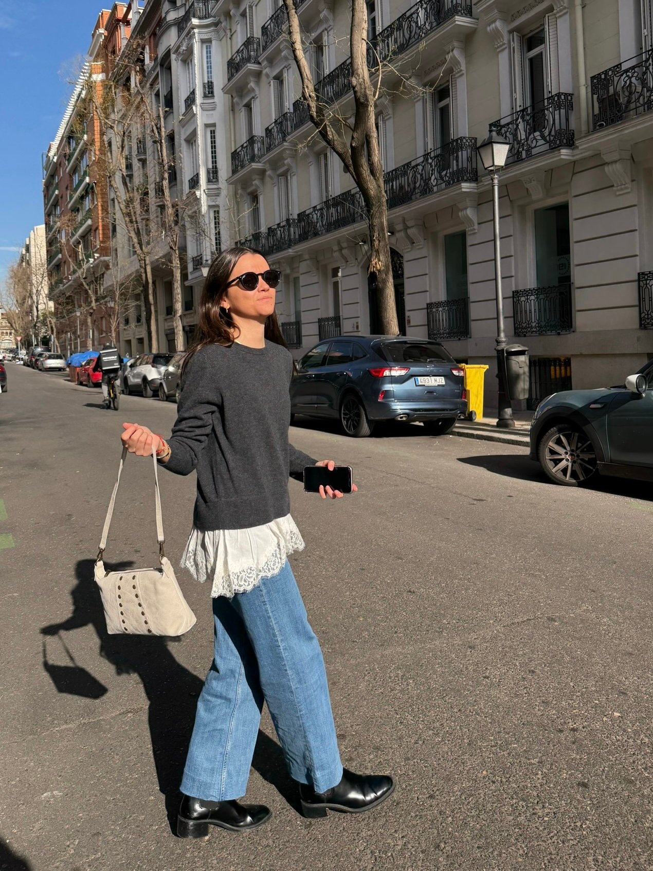 El bolso incluye dos correas: una de 70 cm y otra ajustable hasta 120 cm para llevar al hombro o cruzado.